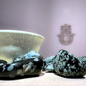 L’ossidiana fiocco di neve è una varietà di ossidiana, é un vetro vulcanico naturale, formatosi quando la lava felsica di un vulcano si raffredda rapidamente con poca o nessuna crescita di cristalli. I motivi dei cristalli di fiocco di neve nell’ossidiana fiocco di neve sono in realtà inclusioni radianti di cristobalite. Questa pietra del chakra stella della terra e della radice è nota come una gemma di integrazione dell’ombra e richiamo di vite passate. Sin dai tempi antichi, i guaritori hanno lavorato con l’ossidiana fiocco di neve per portare in superficie pensieri subconsci e far luce su tutto ciò che giace nascosto e represso. Questo cristallo è anche noto per essere profondamente connesso con il mondo naturale, richiamando la presenza di alleati animali per fornirti saggezza, guida e delicata protezione sul tuo cammino.